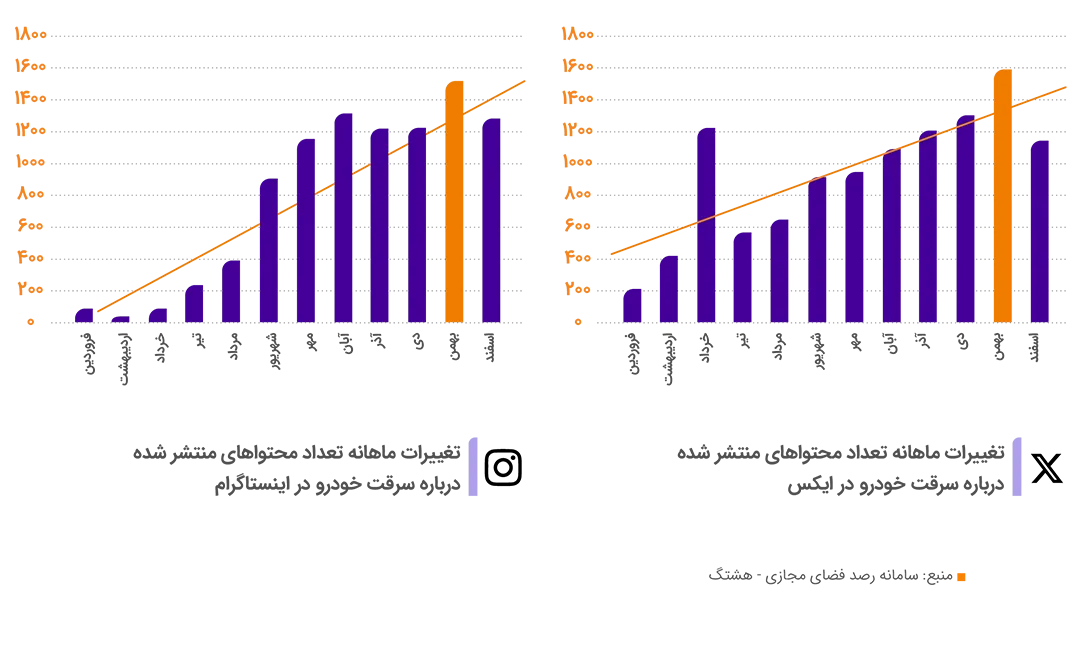 بررسی تعداد محتواهای منتشر شده با کلیدواژههای مرتبط با سرقت خودرو در میان حسابهای کاربری ایکس (توییتر سابق) و صفحات اینستاگرام فارسیزبان بهوضوح نشاندهنده افزایش توجه به این موضوع اجتماعی است. در ماههای پایانی سال ۱۴۰۲، نسبت به ماههای ابتدایی، شاهد رشد چند برابری محتواهای مرتبط با سرقت خودرو در شبکههای اجتماعی هستیم. این افزایش پستها در ایکس و اینستاگرام بیانگر بالا رفتن حساسیت عمومی و توجه بیشتر مردم به معضل سرقت خودرو است.