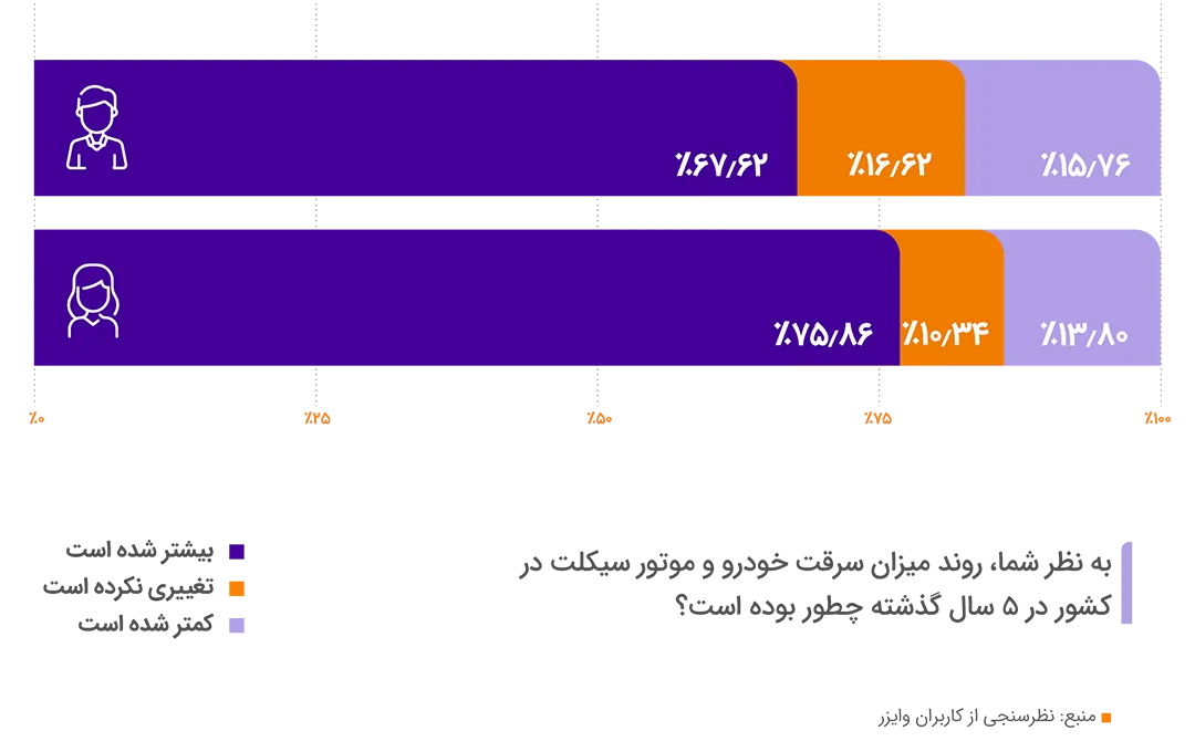 نتایج نظرسنجی از کاربران وایزر به ما نشان میدهد که زنان بیش از مردان احساس میکنند که در پنج سال گذشته میزان سرقت وسایل نقلیه در کشور افزایش پیدا کردهاست.