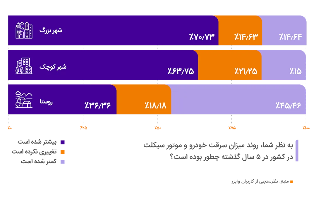 از طرفی در روستاها بیشتر پاسخدهندگان (۴۵ درصد) اظهار کردهاند که احساس میکنند سرقت خودرو در ۵ سال گذشته کاهش یافته و تقریبا نصف میزان شهرنشینها (۳۶ درصد) اظهارکردهاند که تعداد سرقت خودرو و موتور بالا رفته است.