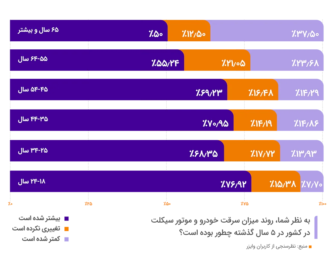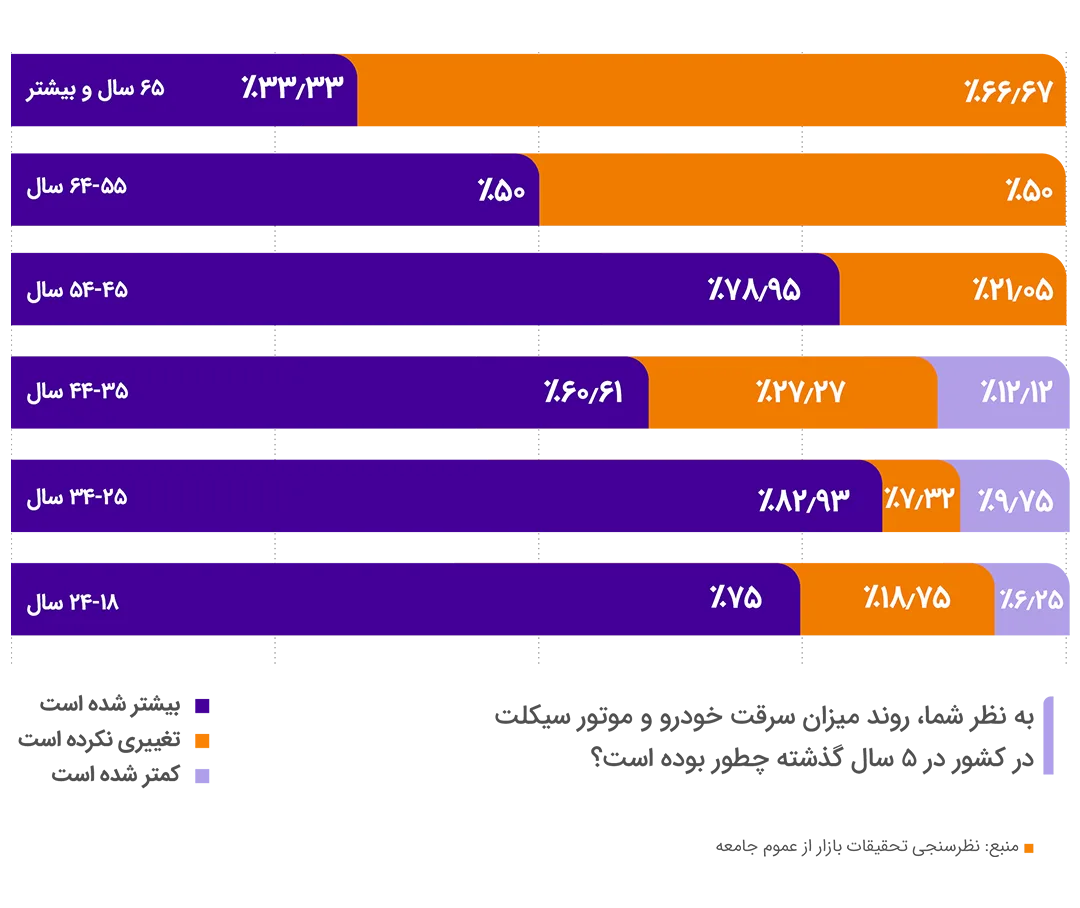 نتایج تحقیقات بازار وایزر از عموم جامعه نشان میدهد هرچه سن پاسخدهندگان بالاتر رفته، تلقی افراد از رشد سرقت در پنج سال گذشته کاهش داشته است. بهطوری که در بازه سنی 25 تا 34 سال، 83 درصد پاسخدهندگان گفتهاند میزان سرقت خودرو افزایشی بوده. درحالیکه تنها 33 درصد پاسخدهندگان در بازه سنی 65 سال و بیشتر چنین اعتقادی دارند.