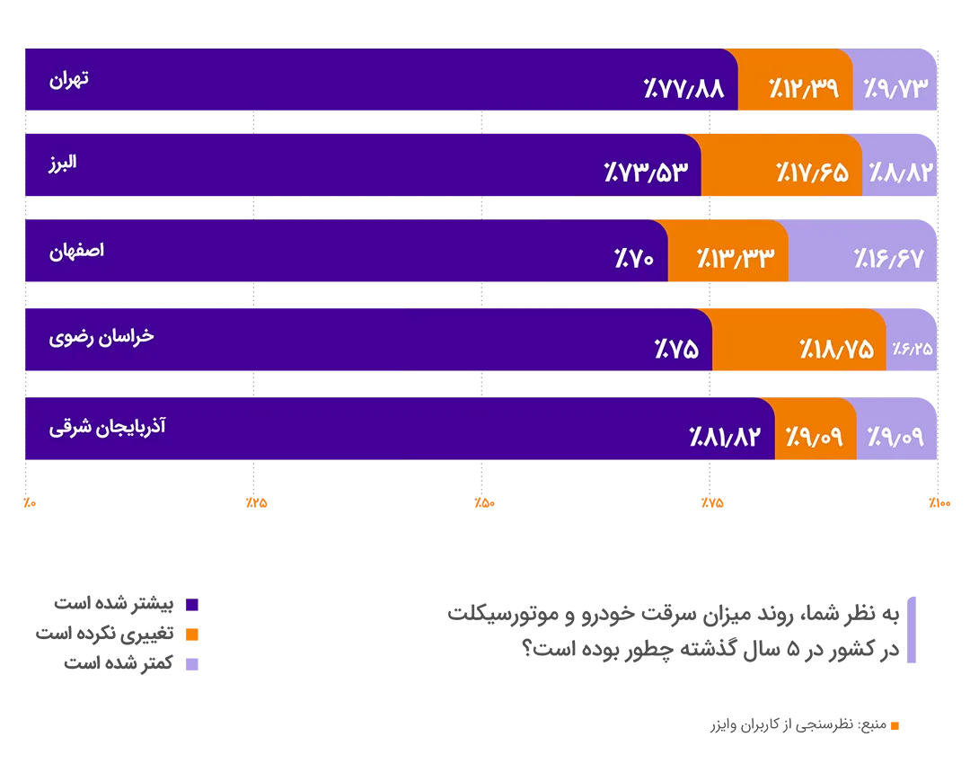 درحالیکه 68 درصد شرکتکنندگان در نظرسنجی در کل کشور، تلقیشان از روند سرقت خودرو در سالهای گذشته صعودی است، در استانهای بزرگ این نسبت بسیار بالاتر است و بعضاً به ۸۱ درصد (آذربایجان شرقی) میرسد. بهطور دقیقتر ۷۸ درصد از تهرانیهای شرکتکننده در نظرسنجی معتقدند میزان سرقت در کشور طی سالهای گذشته افزایش پیدا کرده است.