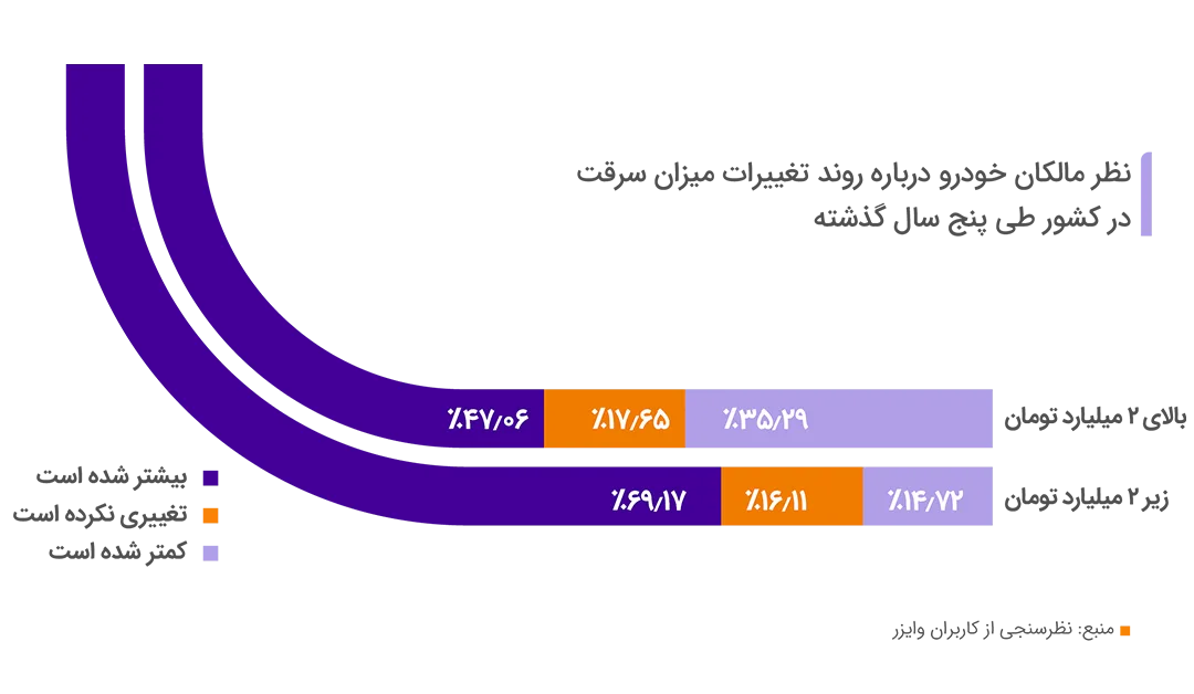 مالکان خودروهای با ارزش کمتر از دو میلیارد تومان بسیار بیشتر از مالکان خودروهای چند میلیاردی، احساس میکنند که سرقت در کشور طی سالهای اخیر افزایش داشته است. بهطوری که 69 درصد از افرادی که خودروهای کمتر از دو میلیارد تومانی دارند، حس میکنند در پنج سال اخیر آمار سرقت خودرو در کشور افزایش پیدا کرده است. این نسبت برای مالکان خودروهای بالای دو میلیارد تومان 47 درصد است. 35 درصد از مالکان این خودروها معتقدند سرقت خودرو در پنج سال گذشته کاهش داشته است.
