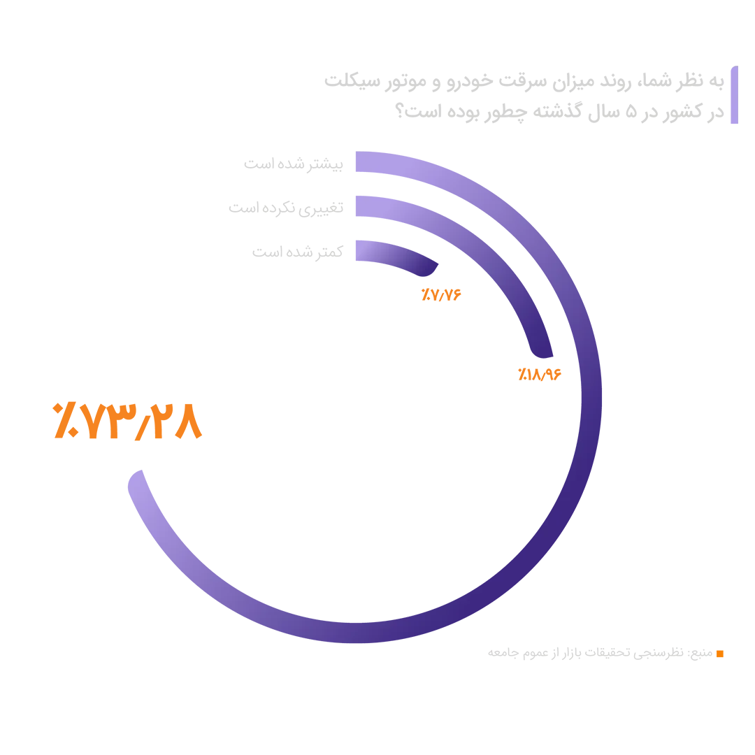 نظرسنجی برگزار شده توسط شرکت وایزر به منظور بررسی شاخصهای ادراک امنیت نشان میدهد ۶۸ درصد از شرکتکنندگان در نظرسنجی احساس میکنند طی پنج سال گذشته سرقت خودرو و موتورسیکلت در کشور بیشتر شده است و تنها ۱۵ درصد معتقدند در سالهای اخیر شاهد کاهش سرقت وسایل نقلیه در کشور بودهایم.