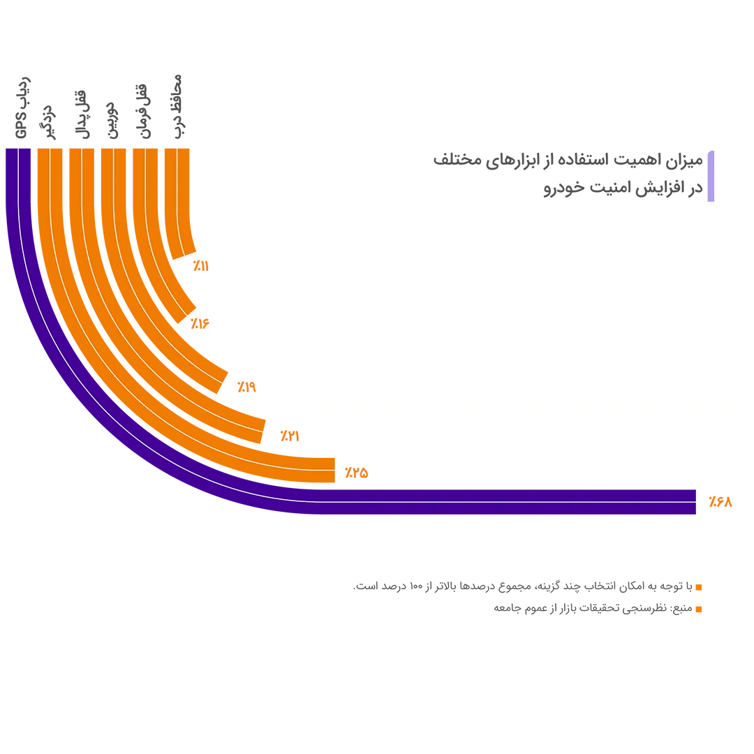 در نظرسنجی تحقیقات بازار از افراد شرکتکننده پرسیده شده به نظرشان کدام وسیله میتواند در جلوگیری از سرقت خودرو یا موتورسیکلت تاثیر بیشتری داشته باشد. 68 درصد از شرکتکنندگان به اهمیت استفاده از ردیاب GPS اشاره کردهاند. دزدگیر، دوربین ثبت وقایع و قفل پدال در رتبههای بعدی بیشترین اهمیت در جلوگیری از سرقت خودرو قرار دارند.
